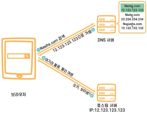 9. 브라우저는 12.123.123.123 IP 주소를 갖고 있는 호스팅 서버에게 웹사이트를 출력하라고 요청합니다.