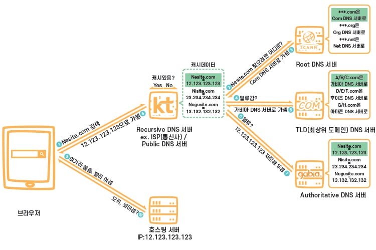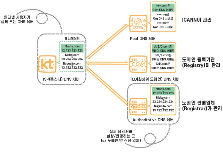 - TLD(최상위 도메인) DNS Server : 도메인 등록 기관이 관리하는 서버로 Authoritative DNS 서버 주소를 저장해 두고 안내하는 역할을 합니다. 어떤 도메인 묶음이 어떤 Authoritative DNS Server에 속하는지 아는 이유는 도메인 판매 업체의 DNS 설정이 변경되면 도메인 등록기관으로 전달이 되기 때문입니다.