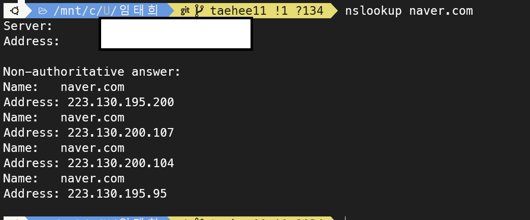 bora.net은 LG의 DNS 서버이며 SK, KT 모두 각각의 DNS 서버를 가지고 있습니다. 또한 nslookup naver.com과 같은 명령어로 웹 사이트들이 가지고 있는 IP주소를 찾을 수 있는데 실행화면은 다음과 같습니다.