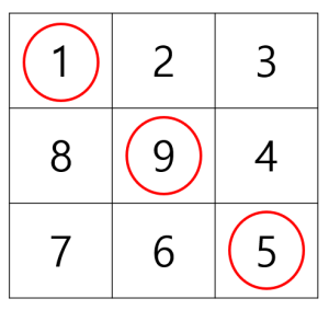 위의 예에서 대각선상에 존재하는 수의 합은 15입니다.
