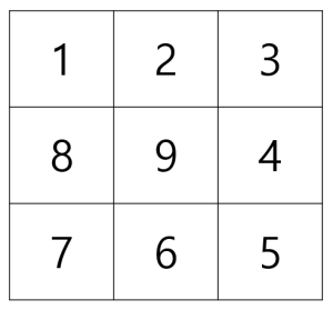 이때 수가 다음과 같은 순서로 배치되어있다면 이것을 n-소용돌이 수라고 부릅니다.