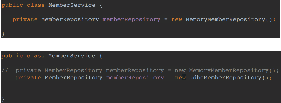 위의 코드를 보면 MemberService 클라이언트가 구현 클래스를 직접 선택하고 있습니다.