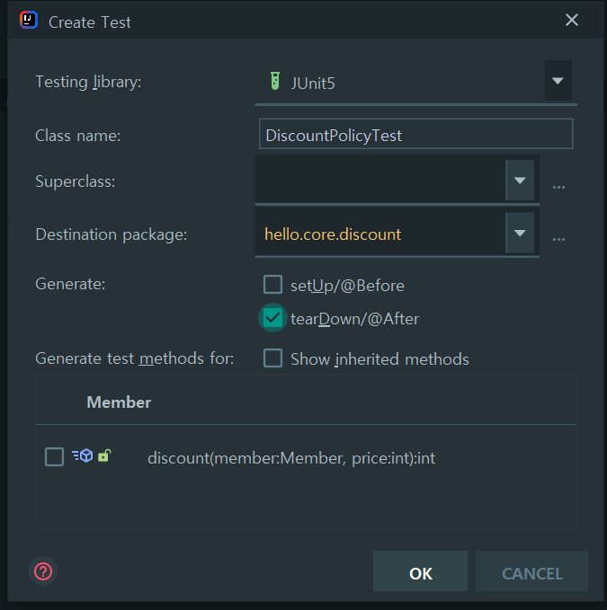 패키지 경로를 지정하거나 생성할 수도 있으며 테스트를 원하는 클래스 이름의 뒤에 자동으로 Test를 붙여서 생성 할 수 있습니다.