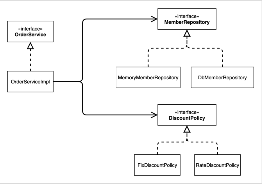 public interface DiscountPolicy { /** * @return 할인 대상 금액 */ int discount(Member member, int price); }import hello.core.member.Grade; import hello.core.member.Member; public class FixDiscountPolicy implements DiscountPolicy { private int discountFixAmount = 1000; //1000원 할인 @Override public int discount(Member member, int price) { if (member.getGrade() == Grade.VIP) { return discountFixAmount; } else { return 0; } } }public class Order { private Long memberId; private String itemName; private int itemPrice; private int discountPrice; public Order(Long memberId, String itemName, int itemPrice, int discountPrice) { this.memberId = memberId; this.itemName = itemName; this.itemPrice = itemPrice; this.discountPrice = discountPrice; } public int calculatePrice() { return itemPrice - discountPrice; } public Long getMemberId() { return memberId; } public String getItemName() { return itemName; } public int getItemPrice() { return itemPrice; } public int getDiscountPrice() { return discountPrice; } @Override public String toString() { return "Order{" + "memberId=" + memberId + ", itemName='" + itemName + '\'' + ", itemPrice=" + itemPrice + ", discountPrice=" + discountPrice + '}'; } }//주문 서비스 인터페이스 public interface OrderService { Order createOrder(Long memberId, String itemName, int itemPrice); }//주문 서비스 구현체 import hello.core.discount.DiscountPolicy; import hello.core.discount.FixDiscountPolicy; import hello.core.member.Member; import hello.core.member.MemberRepository; import hello.core.member.MemoryMemberRepository; public class OrderServiceImpl implements OrderService { private final MemberRepository memberRepository = new MemoryMemberRepository(); private final DiscountPolicy discountPolicy = new FixDiscountPolicy(); @Override public Order createOrder(Long memberId, String itemName, int itemPrice) { Member member = memberRepository.findById(memberId); int discountPrice = discountPolicy.discount(member, itemPrice); return new Order(memberId, itemName, itemPrice, discountPrice); } }주문 생성 요청이 오면, 회원 정보를 조회하고, 할인 정책을 적용한 다음 주문 객체를 생성해서 반환합니다. 메모리 회원 리포지토리와, 고정 금액 할인 정책을 구현체로 생성합니다.
