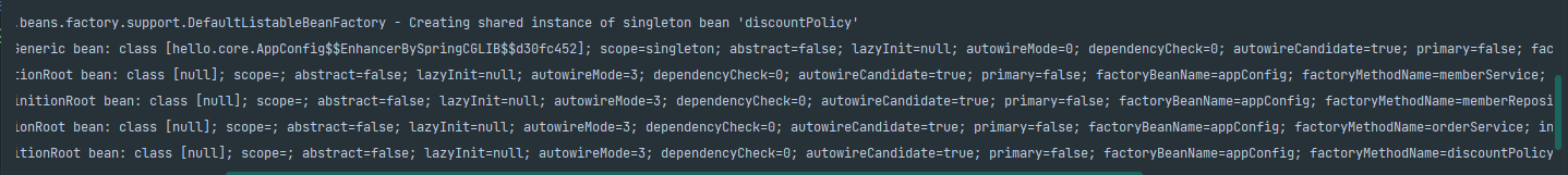 import hello.core.AppConfig; import org.junit.jupiter.api.DisplayName; import org.junit.jupiter.api.Test; import org.springframework.beans.MutablePropertyValues; import org.springframework.beans.factory.config.BeanDefinition; import org.springframework.beans.factory.config.ConstructorArgumentValues; import org.springframework.context.annotation.AnnotationConfigApplicationContext; import org.springframework.context.support.GenericXmlApplicationContext; public class BeanDefinitionTest { AnnotationConfigApplicationContext ac = new AnnotationConfigApplicationContext(AppConfig.class); // GenericXmlApplicationContext ac = new GenericXmlApplicationContext("appConfig.xml"); @Test @DisplayName("빈 설정 메타정보 확인") void findApplicationBean() { String[] beanDefinitionNames = ac.getBeanDefinitionNames(); for (String beanDefinitionName : beanDefinitionNames) { BeanDefinition beanDefinition = ac.getBeanDefinition(beanDefinitionName); if (beanDefinition.getRole() == BeanDefinition.ROLE_APPLICATION) { System.out.println("beanDefinitionName" + beanDefinitionName + " beanDefinition = " + beanDefinition); } } } }위의 코드를 실행시키면 다음과 같은 결과가 나옵니다.