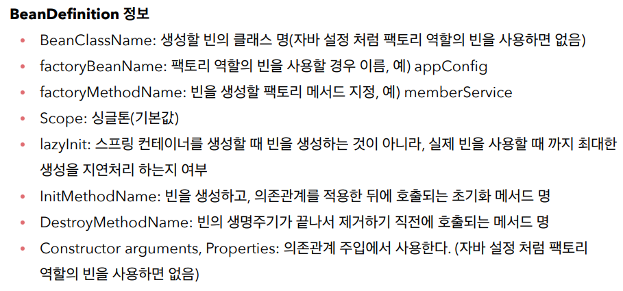 또한, @Bean, <bean> 당 각각 하나씩 메타 정보가 생성되고 스프링 컨테이너는 이 메타정보를 기반으로 스프링 빈을 생성합니다.
