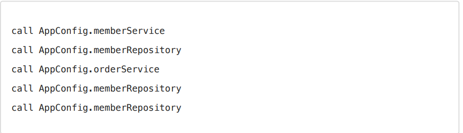 import hello.core.discount.DiscountPolicy; import hello.core.discount.RateDiscountPolicy; import hello.core.member.MemberRepository; import hello.core.member.MemberService; import hello.core.member.MemberServiceImpl; import hello.core.member.MemoryMemberRepository; import hello.core.order.OrderService; import hello.core.order.OrderServiceImpl; import org.springframework.context.annotation.Bean; import org.springframework.context.annotation.Configuration; @Configuration public class AppConfig { @Bean public MemberService memberService() { //1번 System.out.println("call AppConfig.memberService"); return new MemberServiceImpl(memberRepository()); } @Bean public OrderService orderService() { //1번 System.out.println("call AppConfig.orderService"); return new OrderServiceImpl( memberRepository(), discountPolicy()); } @Bean public MemberRepository memberRepository() { //2번? 3번? System.out.println("call AppConfig.memberRepository"); return new MemoryMemberRepository(); } @Bean public DiscountPolicy discountPolicy() { return new RateDiscountPolicy(); } }스프링 컨테이너가 각각 @Bean을 호출해서 스프링 빈을 생성합니다. 그래서 memberRepository()는 총 3번 호출되어야 하는 것 아닐까요?