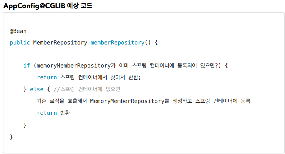 @Bean이 붙은 메서드마다 이미 스프링이 빈이 존재하면 존재하는 빈을 반환하고, 스프링 빈이 없으면 생성해서 스프링 빈으로 등록하고 반환하는 코드가 동적으로 만들어집니다. 그렇기 때문에 싱글톤이 보장되는 것입니다.