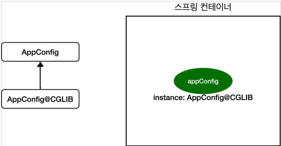 그런데 예상과는 다르게 클래스 명에 xxxCGLIB가 붙으면서 상당히 복잡해졌습니다. 이것은 내가 만든 클래스가 아니라 스프링이 CGLIB라는 바이트코드 조작 라이브러리를 사용해서 AppConfig 클래스를 상속받은 임의의 다른 클래스를 만들고 그 다른 클래스를 스프링 빈으로 등록한 것입니다.
