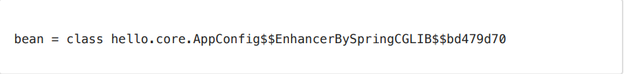 @Test void configurationDeep() { ApplicationContext ac = new AnnotationConfigApplicationContext(AppConfig.class); //AppConfig도 스프링 빈으로 등록된다. AppConfig bean = ac.getBean(AppConfig.class); System.out.println("bean = " + bean.getClass()); //출력: bean = class hello.core.AppConfig$$EnhancerBySpringCGLIB$$bd479d70 }- 사실 AnnotationConfigApplicationContext에 파라미터로 넘긴 값은 스프링 빈으로 등록됩니다.