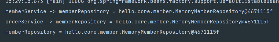 import hello.core.AppConfig; import hello.core.member.MemberRepository; import hello.core.member.MemberServiceImpl; import hello.core.order.OrderServiceImpl; import org.junit.jupiter.api.Test; import org.springframework.context.ApplicationContext; import org.springframework.context.annotation.AnnotationConfigApplicationContext; import static org.assertj.core.api.Assertions.*; public class ConfigurationSingletonTest { @Test void configurationTest() { ApplicationContext ac = new AnnotationConfigApplicationContext(AppConfig.class); MemberServiceImpl memberService = ac.getBean("memberService", MemberServiceImpl.class); OrderServiceImpl orderService = ac.getBean("orderService", OrderServiceImpl.class); MemberRepository memberRepository = ac.getBean("memberRepository", MemberRepository.class); //모두 같은 인스턴스를 참고하고 있다. System.out.println("memberService -> memberRepository = " + memberService.getMemberRepository()); System.out.println("orderService -> memberRepository = " + orderService.getMemberRepository()); System.out.println("memberRepository = " + memberRepository); //모두 같은 인스턴스를 참고하고 있다. assertThat(memberService.getMemberRepository()).isSameAs(memberRepository); assertThat(orderService.getMemberRepository()).isSameAs(memberRepository); } }위의 코드를 실행시키면 다음과 같은 결과가 나옵니다.