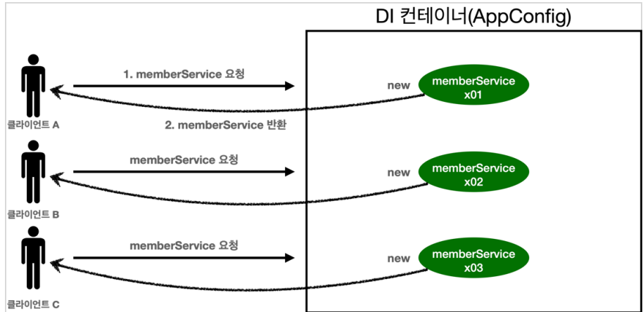 참고: 스프링의 기본 빈 등록 방식은 싱글톤이지만, 싱글톤 방식만 지원하는 것은 아닙니다. 요청할 때마다 새로운 객체를 생성해서 반환하는 기능도 제공합니다. 자세한 내용은 뒤에 빈 스코프에서 설명하겠습니다.