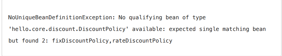 오류 메시지가 친절하게도 하나의 빈을 기대했는데 fixDiscountPolicy, rateDiscountPolicy 2개가 발견되었다고 알려줍니다.