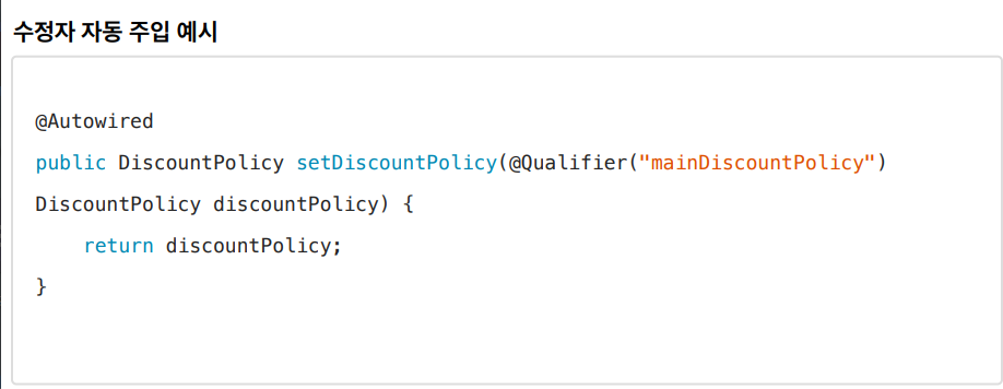 @Autowired public OrderServiceImpl(MemberRepository memberRepository, @Qualifier("mainDiscountPolicy") DiscountPolicy discountPolicy) { this.memberRepository = memberRepository; this.discountPolicy = discountPolicy; }수정자 자동 주입 예시