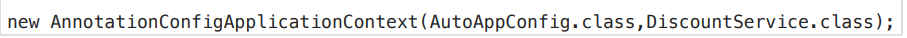 AutoAppConfig.class, DiscountService.class를 파라미터로 넘기면서 해당 클래스를 자동으로 스프링 빈으로 등록합니다. 정리하면 스프링 컨테이너를 생성하면서, 해당 컨테이너 동시에 AutoAppConfig, DiscountService를 스프링 빈으로 자동 등록합니다.