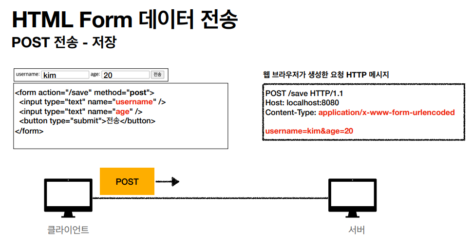 위의 사진과 같이 간단한 HTML FORM이 있다고 가정합시다. input 태그에 내용을 입력하고 전송 버튼을 눌러서 submit 하게 되면 오른쪽의 사진과 같이 요청 HTTP 메시지가 생성됩니다.