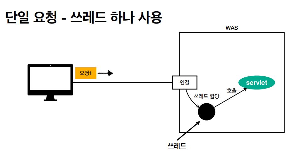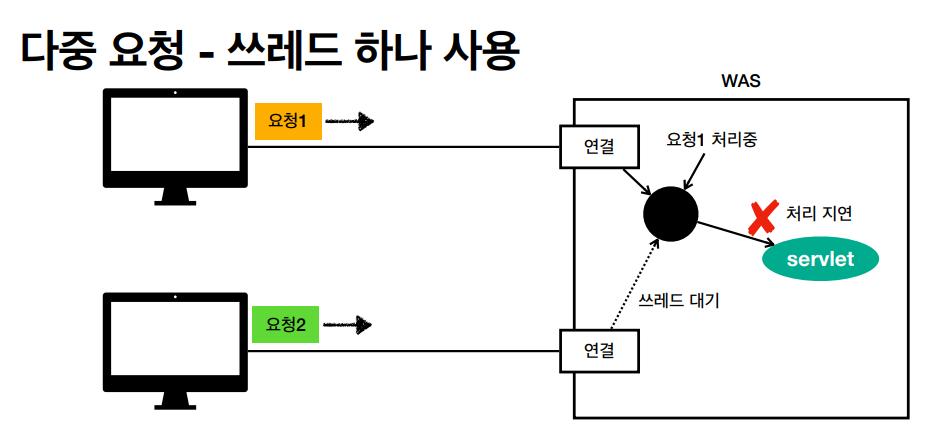 스레드는 하나인데 다중 요청에 들어오게 되면 다른 Request 요청은 스레드의 사용이 끝날 때까지 대기해야 합니다.