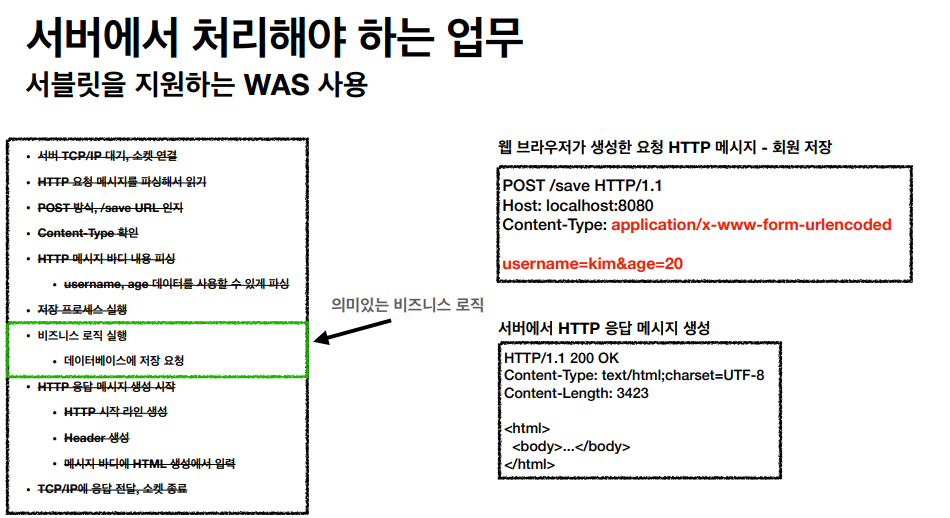 개발자가 이런 모든 작업을 프로그래밍하려면 비효율적이고 힘들겠죠? 그래서 이렇게 귀찮고, 어렵고 반복적인 일을 서블릿을 지원하는 WAS에 위임합니다.