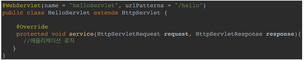1. urlPatterns(/hello)의 URL이 호출되면 서블릿 코드가 실행됩니다.