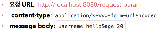 application/x-www-form-urlencoded 형식은 앞서 GET에서 살펴본 쿼리 파라미터 형식과 같습니다. 따라서 쿼리 파라미터 조회 메서드를 그대로 사용하면 됩니다.