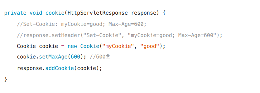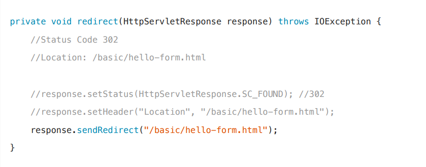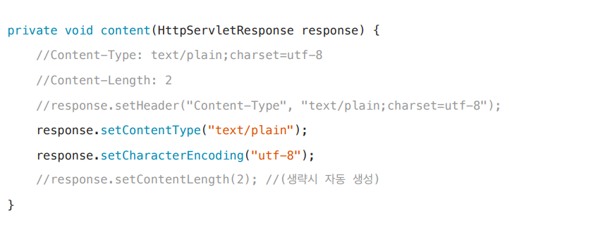 import javax.servlet.ServletException; import javax.servlet.annotation.WebServlet; import javax.servlet.http.Cookie; import javax.servlet.http.HttpServlet; import javax.servlet.http.HttpServletRequest; import javax.servlet.http.HttpServletResponse; import java.io.IOException; import java.io.PrintWriter; /** * http://localhost:8080/response-header * */ @WebServlet(name = "responseHeaderServlet", urlPatterns = "/response-header") public class ResponseHeaderServlet extends HttpServlet { @Override protected void service(HttpServletRequest request, HttpServletResponse response) throws ServletException, IOException { //[status-line] response.setStatus(HttpServletResponse.SC_OK); //200 //[response-headers] response.setHeader("Content-Type", "text/plain;charset=utf-8"); response.setHeader("Cache-Control", "no-cache, no-store, mustrevalidate"); response.setHeader("Pragma", "no-cache"); response.setHeader("my-header","hello"); //[Header 편의 메서드] content(response); cookie(response); redirect(response); //[message body] PrintWriter writer = response.getWriter(); writer.println("ok"); } }Content 편의 메서드