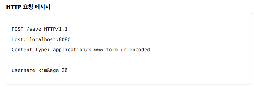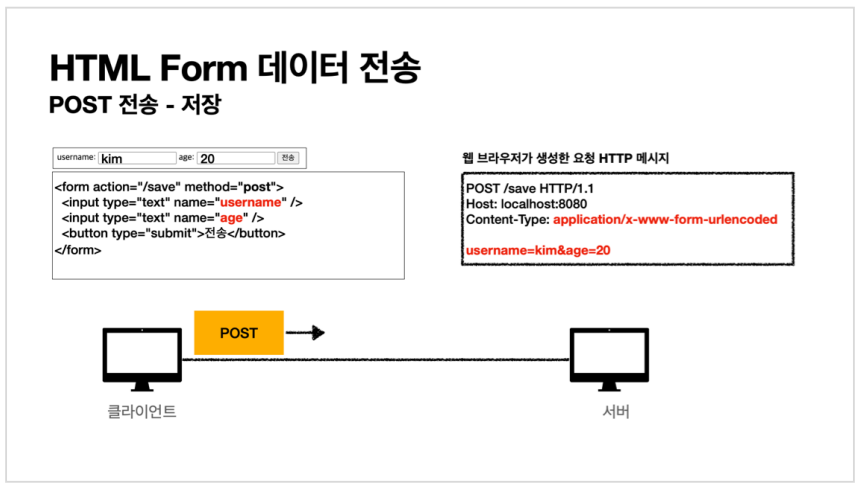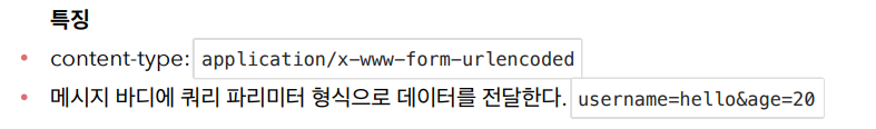 POST HTML Form 형식으로 데이터를 전달하면 HTTP 메시지 바디에 해당 데이터를 포함해서 보내기 때문에 바디에 포함된 데이터가 어떤 형식인지 content-type을 꼭 지정해야 합니다. 이렇게 폼으로 데이터를 전송하는 형식을 application/x-www-form-urlencoded 라 합니다.