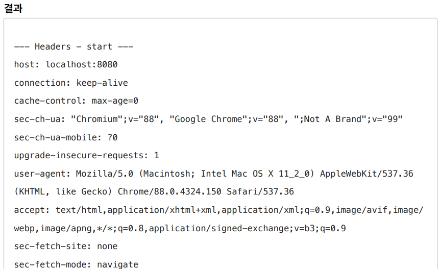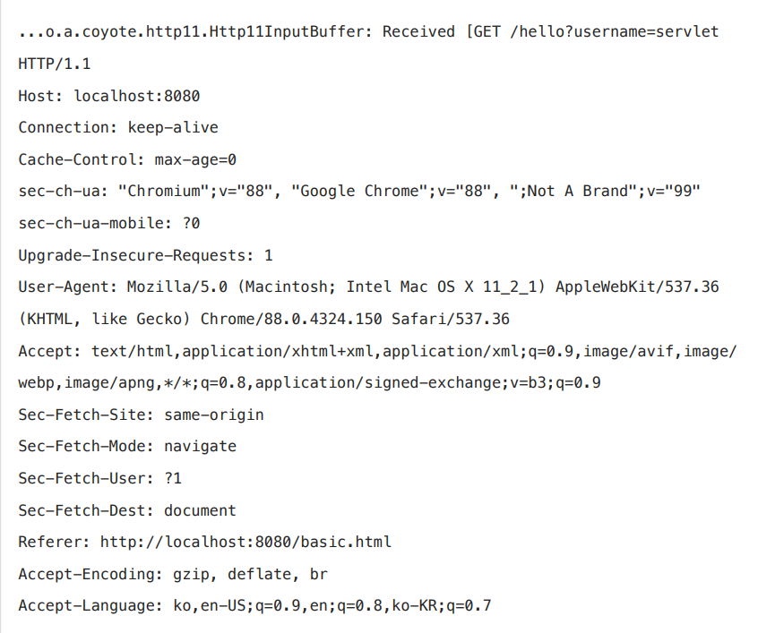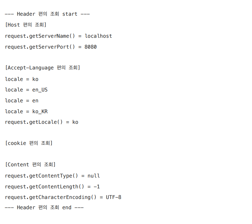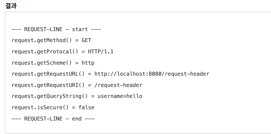 import javax.servlet.ServletException; import javax.servlet.annotation.WebServlet; import javax.servlet.http.*; import java.io.IOException; //http://localhost:8080/request-header?username=hello @WebServlet(name = "requestHeaderServlet", urlPatterns = "/request-header") public class RequestHeaderServlet extends HttpServlet { @Override protected void service(HttpServletRequest request, HttpServletResponse response) throws ServletException, IOException { printStartLine(request); printHeaders(request); printHeaderUtils(request); printEtc(request); response.getWriter().write("ok"); } } start-line 정보 //start line 정보 private void printStartLine(HttpServletRequest request) { System.out.println("--- REQUEST-LINE - start ---"); System.out.println("request.getMethod() = " + request.getMethod()); //GET System.out.println("request.getProtocal() = " + request.getProtocol()); // HTTP/1.1 System.out.println("request.getScheme() = " + request.getScheme()); //http // http://localhost:8080/request-header System.out.println("request.getRequestURL() = " + request.getRequestURL()); // /request-test System.out.println("request.getRequestURI() = " + request.getRequestURI()); //username=hi System.out.println("request.getQueryString() = " + request.getQueryString()); System.out.println("request.isSecure() = " + request.isSecure()); //https 사용 유무 System.out.println("--- REQUEST-LINE - end ---"); System.out.println(); } //Header 모든 정보 private void printHeaders(HttpServletRequest request) { System.out.println("--- Headers - start ---"); /* Enumeration<String> headerNames = request.getHeaderNames(); while (headerNames.hasMoreElements()) { String headerName = headerNames.nextElement(); System.out.println(headerName + ": " + request.getHeader(headerName)); } */ request.getHeaderNames().asIterator() .forEachRemaining(headerName -> System.out.println(headerName + ": " + request.getHeader(headerName))); System.out.println("--- Headers - end ---"); System.out.println(); } //Header 편리한 조회 private void printHeaderUtils(HttpServletRequest request) { System.out.println("--- Header 편의 조회 start ---"); System.out.println("[Host 편의 조회]"); System.out.println("request.getServerName() = " + request.getServerName()); //Host 헤더 System.out.println("request.getServerPort() = " + request.getServerPort()); //Host 헤더 System.out.println(); System.out.println("[Accept-Language 편의 조회]"); request.getLocales().asIterator() .forEachRemaining(locale -> System.out.println("locale = " + locale)); System.out.println("request.getLocale() = " + request.getLocale()); System.out.println(); System.out.println("[cookie 편의 조회]"); if (request.getCookies() != null) { for (Cookie cookie : request.getCookies()) { System.out.println(cookie.getName() + ": " + cookie.getValue()); } } System.out.println(); System.out.println("[Content 편의 조회]"); System.out.println("request.getContentType() = " + request.getContentType()); System.out.println("request.getContentLength() = " + request.getContentLength()); System.out.println("request.getCharacterEncoding() = " + request.getCharacterEncoding()); System.out.println("--- Header 편의 조회 end ---"); System.out.println(); } //Header 편리한 조회 private void printHeaderUtils(HttpServletRequest request) { System.out.println("--- Header 편의 조회 start ---"); System.out.println("[Host 편의 조회]"); System.out.println("request.getServerName() = " + request.getServerName()); //Host 헤더 System.out.println("request.getServerPort() = " + request.getServerPort()); //Host 헤더 System.out.println(); System.out.println("[Accept-Language 편의 조회]"); request.getLocales().asIterator() .forEachRemaining(locale -> System.out.println("locale = " + locale)); System.out.println("request.getLocale() = " + request.getLocale()); System.out.println(); System.out.println("[cookie 편의 조회]"); if (request.getCookies() != null) { for (Cookie cookie : request.getCookies()) { System.out.println(cookie.getName() + ": " + cookie.getValue()); } } System.out.println(); System.out.println("[Content 편의 조회]"); System.out.println("request.getContentType() = " + request.getContentType()); System.out.println("request.getContentLength() = " + request.getContentLength()); System.out.println("request.getCharacterEncoding() = " + request.getCharacterEncoding()); System.out.println("--- Header 편의 조회 end ---"); System.out.println(); }printStartLine 결과