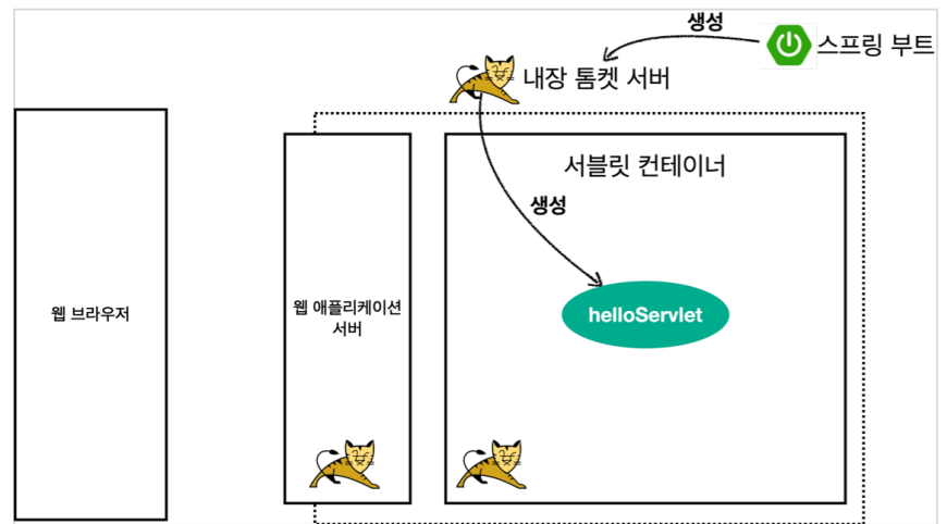내장 톰캣 서버가 서블릿 컨테이너를 생성하고 @WebServlet이 달린 클래스를 찾아서 name으로 싱글톤 형태로 객체를 등록합니다.