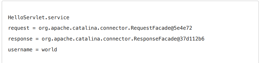 import javax.servlet.ServletException; import javax.servlet.annotation.WebServlet; import javax.servlet.http.HttpServlet; import javax.servlet.http.HttpServletRequest; import javax.servlet.http.HttpServletResponse; import java.io.IOException; @WebServlet(name = "helloServlet", urlPatterns = "/hello") public class HelloServlet extends HttpServlet { @Override protected void service(HttpServletRequest request, HttpServletResponse response) throws ServletException, IOException { System.out.println("HelloServlet.service"); System.out.println("request = " + request); System.out.println("response = " + response); String username = request.getParameter("username"); System.out.println("username = " + username); response.setContentType("text/plain"); response.setCharacterEncoding("utf-8"); response.getWriter().write("hello " + username); } }@WebServlet 서블리 어노테이션