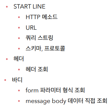 HTTP 요청 메시지를 개발자가 직접 파싱 해서 사용해도 되지만, 매우 불편할 것입니다. 서블릿은 개발자가 HTTP 요청 메시지를 편리하게 사용할 수 있도록 개발자 대신에 HTTP 요청 메시지를 파싱 합니다. 그리고 그 결과를 HttpServletRequest 객체에 담아서 제공합니다. HttpServletRequest를 사용하면 다음과 같은 HTTP 요청 메시지를 편리하게 조회할 수 있습니다.