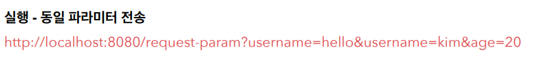 username=hello&username=kim과 같이 파라미터 이름은 하나인데, 값이 중복이면 어떻게 될까요?? request.getParameter()는 하나의 파라미터 이름에 대해서 단 하나의 값만 있을 때 사용해야 합니다. 지금처럼 중복일 때는 request.getParameterValues()를 사용해야 합니다. 참고로 이렇게 중복일 때 request.getParameter()를 사용하면 request.getParameterValues()의 첫 번째 값을 반환합니다.