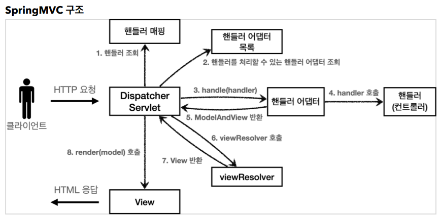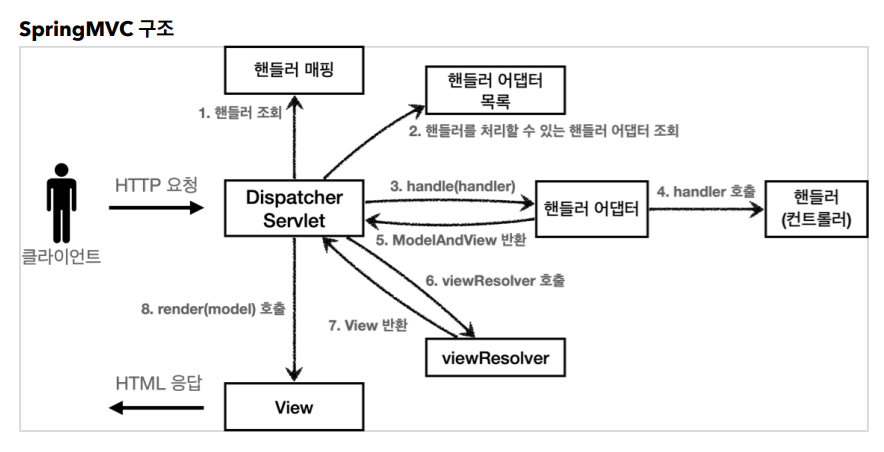 핸들러 실행 : 핸들러 어댑터가 실제 핸들러를 실행합니다.