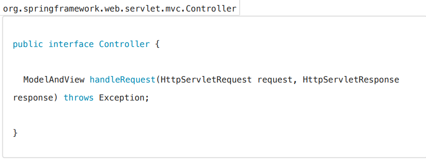 import org.springframework.stereotype.Component; import org.springframework.web.servlet.ModelAndView; import org.springframework.web.servlet.mvc.Controller; import javax.servlet.http.HttpServletRequest; import javax.servlet.http.HttpServletResponse; @Component("/springmvc/old-controller") public class OldController implements Controller { @Override public ModelAndView handleRequest(HttpServletRequest request, HttpServletResponse response) throws Exception { System.out.println("OldController.handleRequest"); return null; } }@Component : 이 컨트롤러는 /springmvc/old-controller라는 이름의 스프링 빈으로 등록되었습니다.