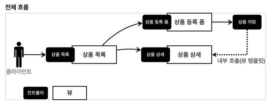 클라이언트는 상품 등록 Form에 가서 주문을 하고 버튼을 누르면 컨트롤러에서 요청을 받아서 DB에 insert를 해주고 주문한 상품의 고유번호를 받아서 상품 상세 페이지를 고객에게 보여줍니다.
