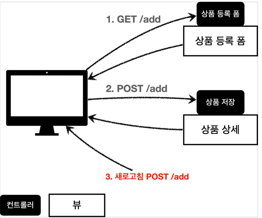 상품 등록 폼에서 데이터를 입력하고 저장을 선택하면 POST로 상품 데이터를 전송하고 이 상태에서 새로 고침을 또 선택하면 마지막에 전송한 POST로 상품 데이터를 서버로 다시 전송하기 때문에 내용은 같고 고유번호만 다른 상품 데이터가 계속 쌓이게 됩니다.