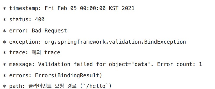BasicErrorController 컨트롤러는 다음 정보를 model에 담아서 뷰에 전달합니다. 뷰 템플릿은 이 값을 활용해서 출력할 수 있습니다.