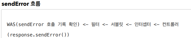 오류가 발생했을 때 HttpServletResponse가 제공하는 sendError라는 메서드를 사용해도 됩니다. 이것을 호출한다고 당장 예외가 발생하는 것은 아니지만, 서블릿 컨테이너에게 오류가 발생했다는 점을 전달할 수 있습니다. 이 메서드를 사용하면 HTTP 상태 코드와 오류 메시지도 추가할 수 있습니다.